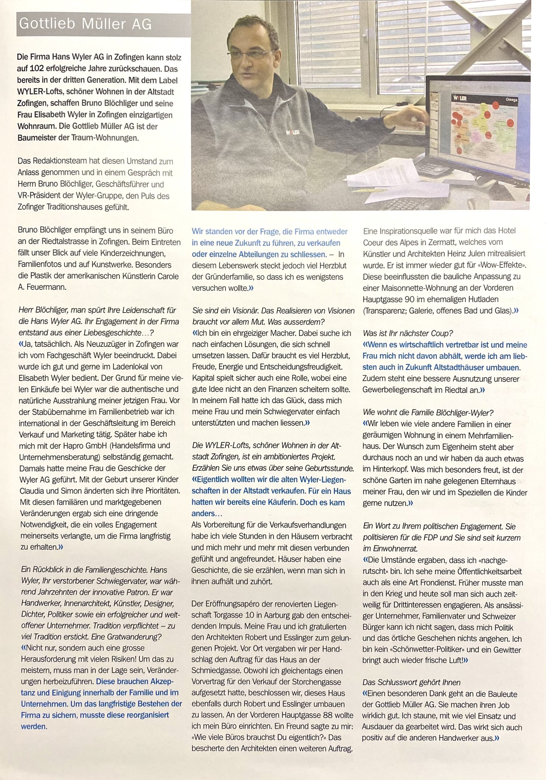 Die Wyler Wohnen AG hat mit dem Umbau der Altstadtliegenschaften in Zofingen auch einen strategischen Richtungswechsel vorgenommen. Das Handwerk d.h. der traditionelle Gewerbebetrieb wurde mit seiner über 100 Jahren alten Familientradition per Ende 2012 eingestellt.